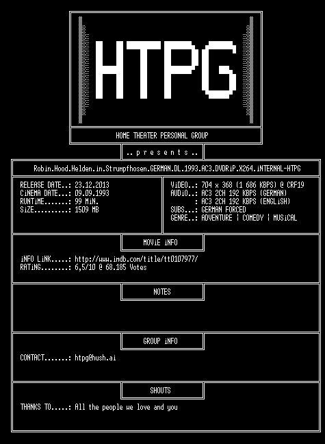 | FiLENAME: | Robin.Hood.Helden.in.Strumpfhosen.GERMAN.DL.1993.AC3.DVDRiP.X264.iNTERNAL-HTPG.mkv |