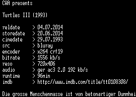 | FiLENAME: | Turtles.III.1993.German.BDRip.x264.iNTERNAL-CWA.mkv |