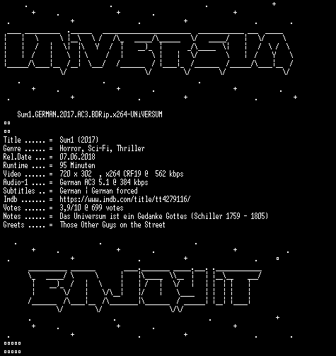 | FiLENAME: | Sum1.GERMAN.2017.AC3.BDRip.x264-UNiVERSUM.mkv |
