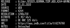 | FiLENAME: | Wilder.S01E03.GERMAN.720P.WEB.X264-WAYNE.mkv |