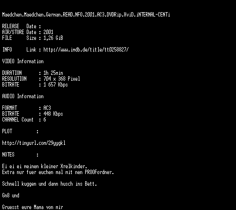 | FiLENAME: | Maedchen.Maedchen.German.READ.NFO.2001.AC3.DVDRip.XviD.iNTERNAL-CENTi.avi |