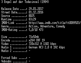 | FiLENAME: | Drei.Engel.auf.der.Todesinsel.German.1984.AC3.BDRip.x264-SPiCY.mkv |