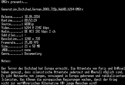 | FiLENAME: | Generation.Dschihad.German.DOKU.720p.WebHD.h264-OMGtv.mkv |