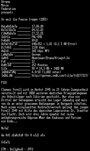| FiLENAME: | So.weit.die.Fuesse.tragen.German.2001.DVDRiP.iNTERNAL.XViD-XMF.CD2.avi |