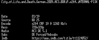 | FiLENAME: | City.of.Life.and.Death.German.2009.AC3.BDRiP.x264.iNTERNAL-EXPS.mkv |