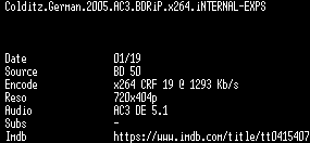 | FiLENAME: | Colditz.German.2005.AC3.BDRiP.x264.iNTERNAL-EXPS.mkv |