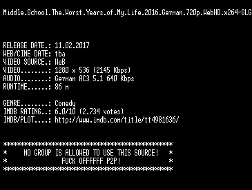 | FiLENAME: | Middle.School.The.Worst.Years.of.My.Life.2016.German.720p.WebHD.x264-SLG.mkv |