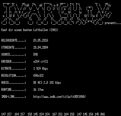 | FiLENAME: | Kauf.dir.einen.bunten.Luftballon.1961.German.DVDRip.x264.iNTERNAL-TVARCHiV.mkv |