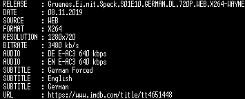 | FiLENAME: | Gruenes.Ei.mit.Speck.S01E10.GERMAN.DL.720P.WEB.X264-WAYNE.mkv |