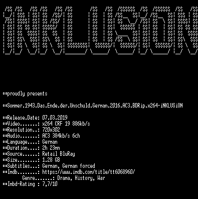 | FiLENAME: | Sommer.1943.Das.Ende.der.Unschuld.German.2016.AC3.BDRip.x264-iNKLUSiON.mkv |