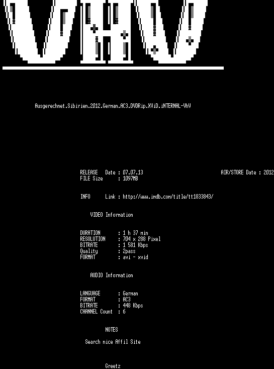 | FiLENAME: | Ausgerechnet.Sibirien.2012.German.AC3.DVDRip.XViD.iNTERNAL-VhV.avi |