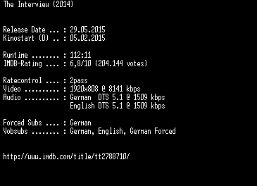 | FiLENAME: | The.Interview.2014.German.DL.1080p.BluRay.x264-EXQUiSiTE.mkv |