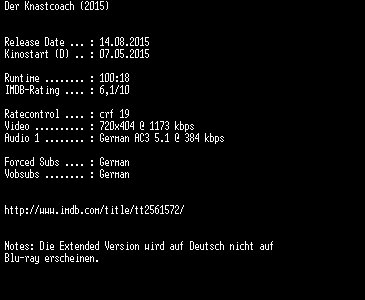 | FiLENAME: | Der.Knastcoach.German.2015.AC3.BDRiP.x264-EXQUiSiTE.mkv |