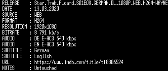| FiLENAME: | Star.Trek.Picard.S01E08.GERMAN.DL.1080P.WEB.H264-WAYNE.mkv |