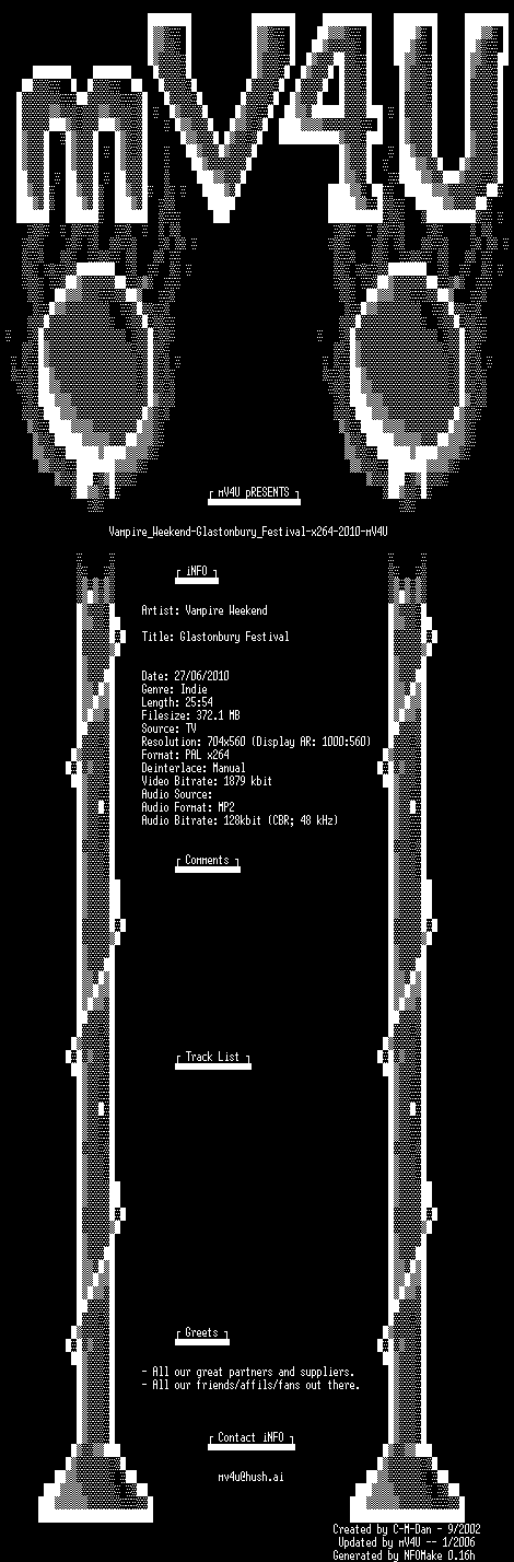 | FiLENAME: | Vampire_Weekend-Glastonbury_Festival-x264-2010-mV4U.mkv |