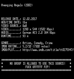 | FiLENAME: | Avenging.Angelo.2002.German.720p.WebHD.x264-SLG.mkv |