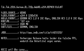| FiLENAME: | Tik.Tok.2016.German.DL.720p.WebHD.x264.REPACK-BiGiNT.mkv |