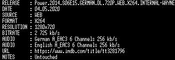 | FiLENAME: | Power.2014.S06E15.GERMAN.DL.720P.WEB.X264.INTERNAL-WAYNE.mkv |