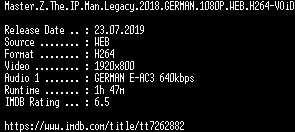 | FiLENAME: | Master.Z.The.IP.Man.Legacy.2018.GERMAN.1080P.WEB.H264-VOiD.mkv |