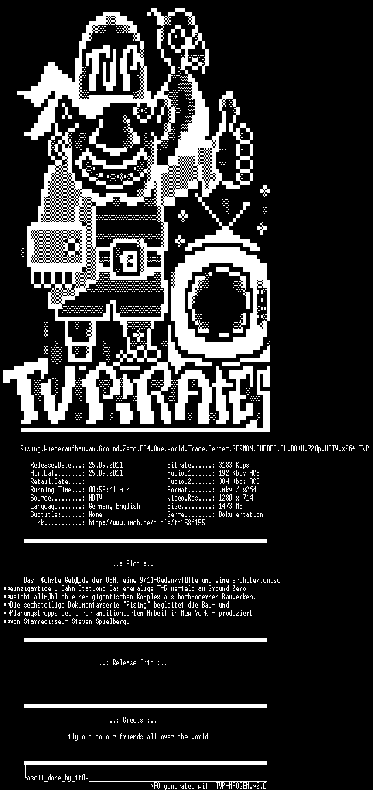 | FiLENAME: | Rising.Wiederaufbau.an.Ground.Zero.E04.One.World.Trade.Center.GERMAN.DUBBED.DL.DOKU.720p.HDTV.x264-TVP.mkv |