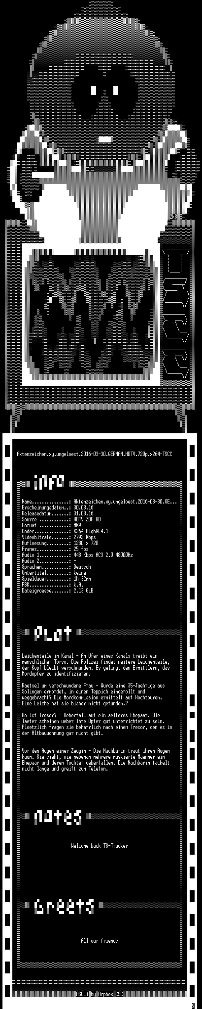 | FiLENAME: | Aktenzeichen.xy.ungeloest.2016-03-30.GERMAN.HDTV.720p.x264-TSCC.mkv |