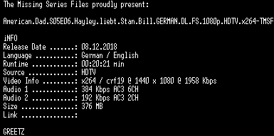 | FiLENAME: | American.Dad.S05E06.Hayley.liebt.Stan.Bill.GERMAN.DL.FS.1080p.HDTV.x264-TMSF.mkv |