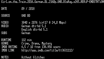 | FiLENAME: | Girl.on.the.Train.2016.German.DL.2160p.UHD.BluRay.x265.RERiP-ENDSTATiON.mkv |