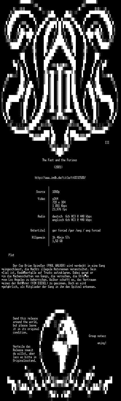 | FiLENAME: | The Fast and the Furious (2001) [DL-AC3 WS BD].mkv |