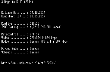 | FiLENAME: | 3.Days.to.Kill.German.BDRiP.x264-EXQUiSiTE.mkv |