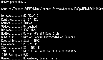 | FiLENAME: | Game.of.Thrones.S08E04.Die.letzten.Starks.German.1080p.WEB.h264-OMGtv.mkv |