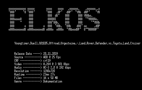 | FiLENAME: | Youngtimer.Duell.S01E05.Offroad.Urgesteine.-.Land.Rover.Defender.vs.Toyota.Land.Cruiser.GERMAN.DOKU.720p.WebHD.x264-ELKOS.mkv |