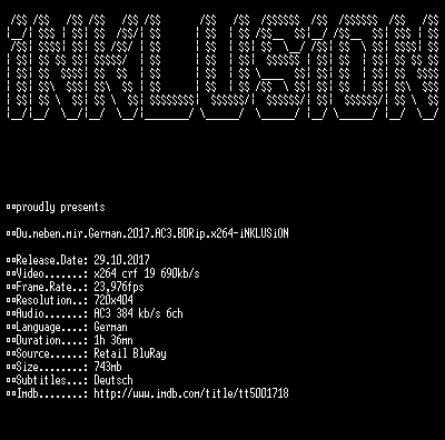 | FiLENAME: | Du.neben.mir.German.2017.AC3.BDRip.x264-iNKLUSiON.mkv |