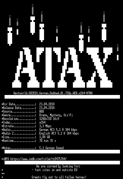 | FiLENAME: | Westworld.S02E01.German.Dubbed.DL.720p.WEB.h264.iNTERNAL-ATAX.mkv |