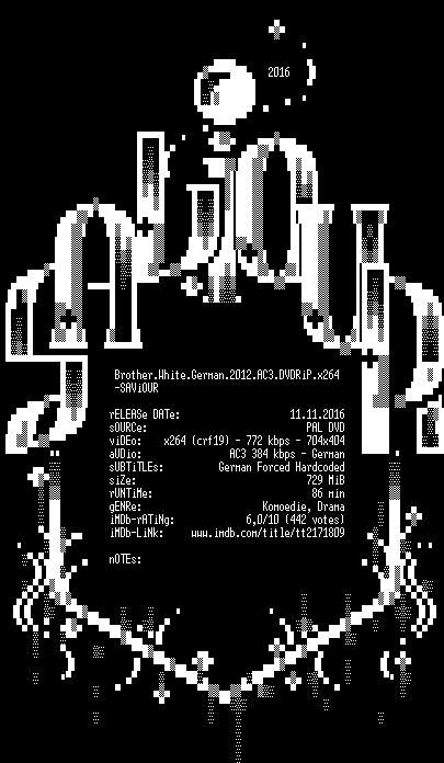 | FiLENAME: | Brother.White.German.2012.AC3.DVDRiP.x264-SAViOUR.mkv |