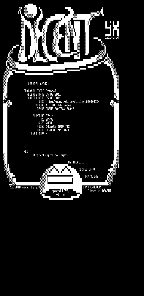 | FiLENAME: | Grendel.German.2007.DVDRip.XviD-DECENT.avi |