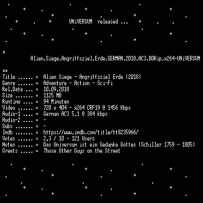 | FiLENAME: | Alien.Siege.Angriffsziel.Erde.GERMAN.2018.AC3.BDRip.x264-UNiVERSUM.mkv |