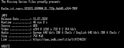 | FiLENAME: | Rache.ist.suess.S01E01.GERMAN.DL.720p.WebHD.x264-TMSF.mkv |