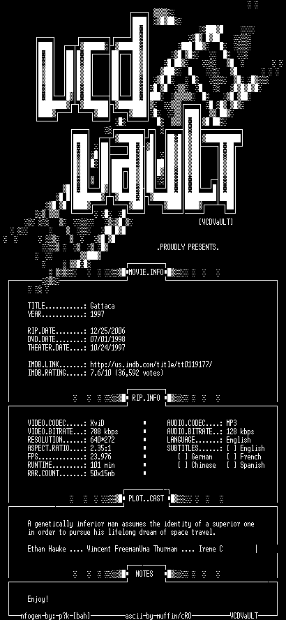 | FiLENAME: | Gattaca.1997.iNTERNAL.DVDRip.XviD-VCDVaULT.avi |