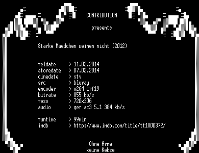 | FiLENAME: | Starke.Maedchen.weinen.nicht.2012.German.BDRip.x264-CONTRiBUTiON.mkv |