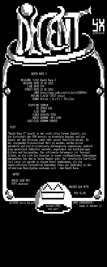 | FiLENAME: | Death.Race.2.German.2010.BDRip.XviD.PROPER-DECENT.avi |