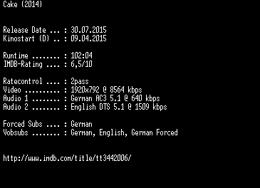 | FiLENAME: | Cake.2014.German.DL.1080p.BluRay.x264-EXQUiSiTE.mkv |