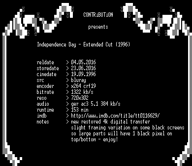 | FiLENAME: | Independence.Day.1996.Extended.German.BDRip.x264-CONTRiBUTiON.mkv |