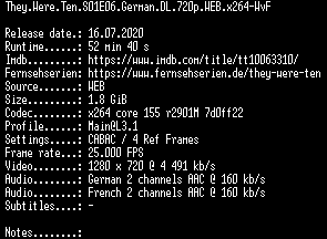 | FiLENAME: | They.Were.Ten.S01E06.German.DL.720p.WEB.x264-WvF.mkv |