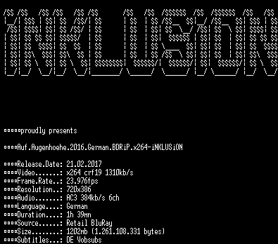 | FiLENAME: | Auf.Augenhoehe.2016.German.BDRiP.x264-iNKLUSiON.mkv |