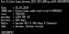| FiLENAME: | Der.Killerclown.German.2017.AC3.BDRip.x264-CHECKMATE.mkv |