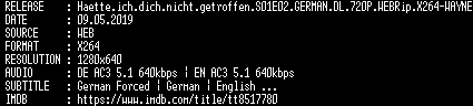 | FiLENAME: | Haette.ich.dich.nicht.getroffen.S01E02.GERMAN.DL.720P.WEBRip.X264-WAYNE.mkv |