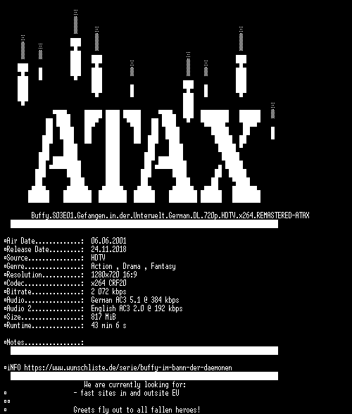 | FiLENAME: | Buffy.S03E01.Gefangen.in.der.Unterwelt.German.DL.720p.HDTV.x264.REMASTERED-ATAX.mkv |