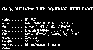 | FiLENAME: | The.Spy.S01E04.GERMAN.DL.HDR.1080p.WEB.h265.iNTERNAL-EiSBOCK.mkv |