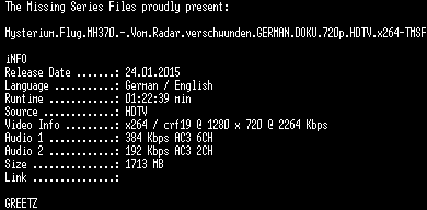 | FiLENAME: | Mysterium.Flug.MH370.-.Vom.Radar.verschwunden.GERMAN.DOKU.720p.HDTV.x264-TMSF.mkv |