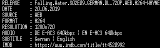 | FiLENAME: | Falling.Water.S02E09.GERMAN.DL.720P.WEB.H264-WAYNE.mkv |